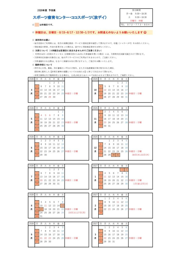 ◆放課後等デイサービス 2026年度 年間カレンダー